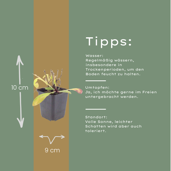 Hinweis: Pflanzen sind lebende Produkte und können von Foto und Beschreibung abweichen. Kleine Unregelmäßigkeiten können auftreten, erholen sich jedoch meist im Garten. Unsere Pflanzen sind kräftig, nachhaltig und werden direkt aus unserer Gärtnerei in recycelbaren Anzuchttöpfen geliefert.
